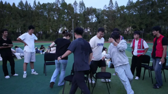 抢板凳游戏环节充分体现师生互动性。数字商务学院指导老师主动参与,与新生共同围圈配合音乐完成游戏,过程中师生协作互动,现场氛围热烈有序,有效增进了师生间的亲近感,助力新生快速融入集体