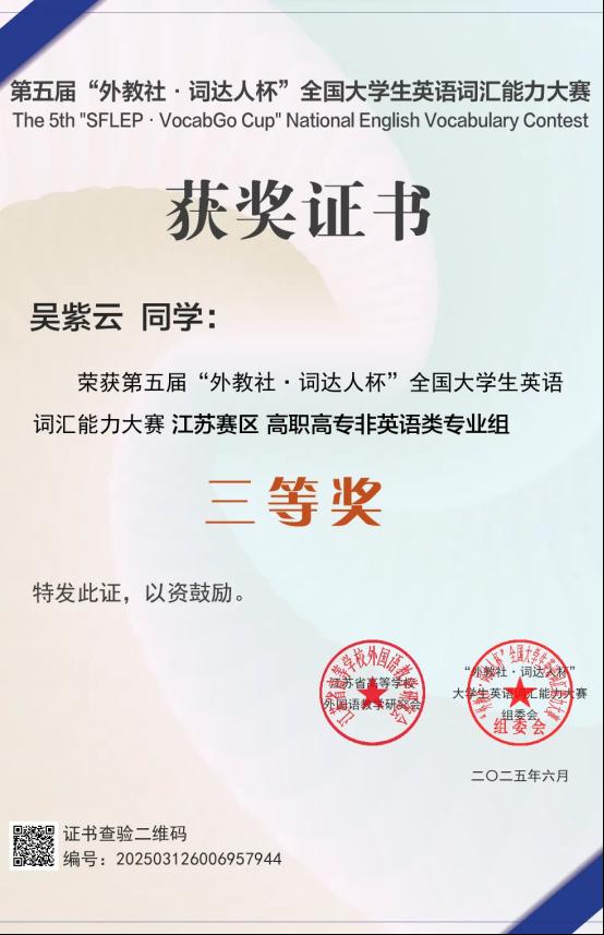 2025年6月,由高等学校大学外语教学研究会和全国高等师范院校外语教学与研究协作组共同组织的2025年全国大学生英语作文大赛中,来自于数字商务学院会计242班的吴紫云同学喜获省级一等奖!