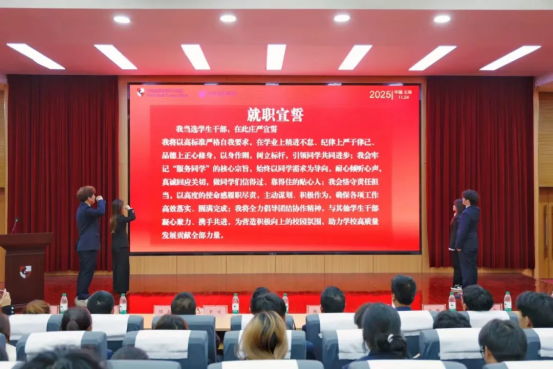新任学生干部带领全体团学干部庄严宣誓。誓言铿锵,承诺恪守章程、服务同学、勤勉工作,秉承奉献精神,为学院发展贡献青春力。