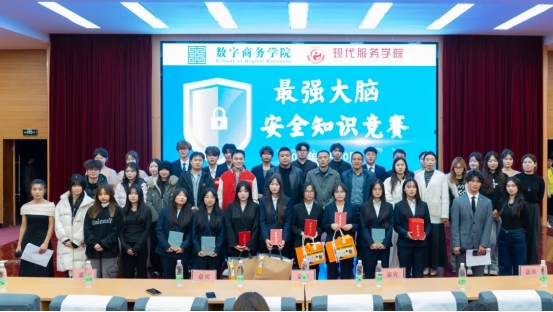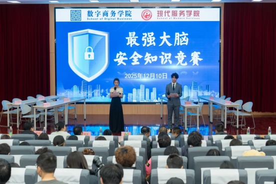 为筑牢校园安全防线,提升学生反诈意识,数字商务学院与现代服务学院于12月10日在博学B101报告厅联合举办“最强大脑-安全知识竞赛”。学生工作部副部长鲁金雄老师、现代服务学院党总支副书记王海峰、数字商务学院党总支副书记李可、各二级学院团总支书记、参赛选手与学生代表共同参与此次活动。