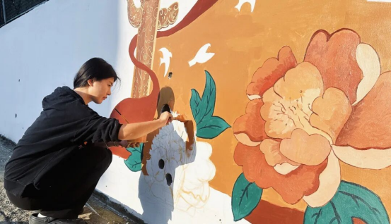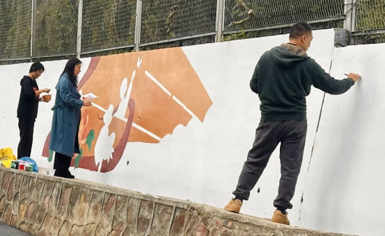墙绘工程从方案构思到落地实施,凝聚着团队的心血与智慧。方案研讨阶段,师生反复打磨细节,既要贴合“山水学府”的校园气质,又要彰显“为党育人,为国育才”的使命担当;绘制过程中,大家高效分工、默契协作——专业课老师全程专业指导,把控色彩搭配与构图比例;环艺专业同学满怀热忱投入实践,一笔一画勾勒轮廓、填充色彩。每一处线条的勾勒都凝聚着专注,每一抹色彩的晕染都承载着热爱。