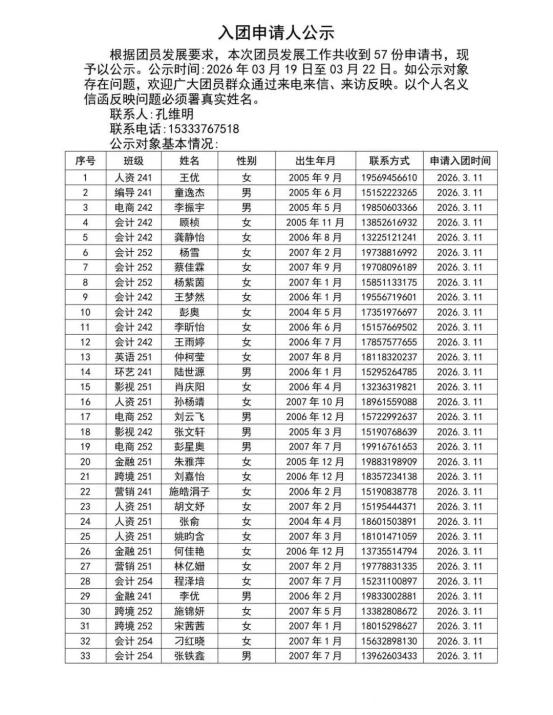 为加强团员队伍建设,严把“入口关”,我院按照上级团组织要求和团员发展工作规定,认真组织开展了2026年春季入团申请人选拔工作。现将初步确定的入团申请人名单予以公示。